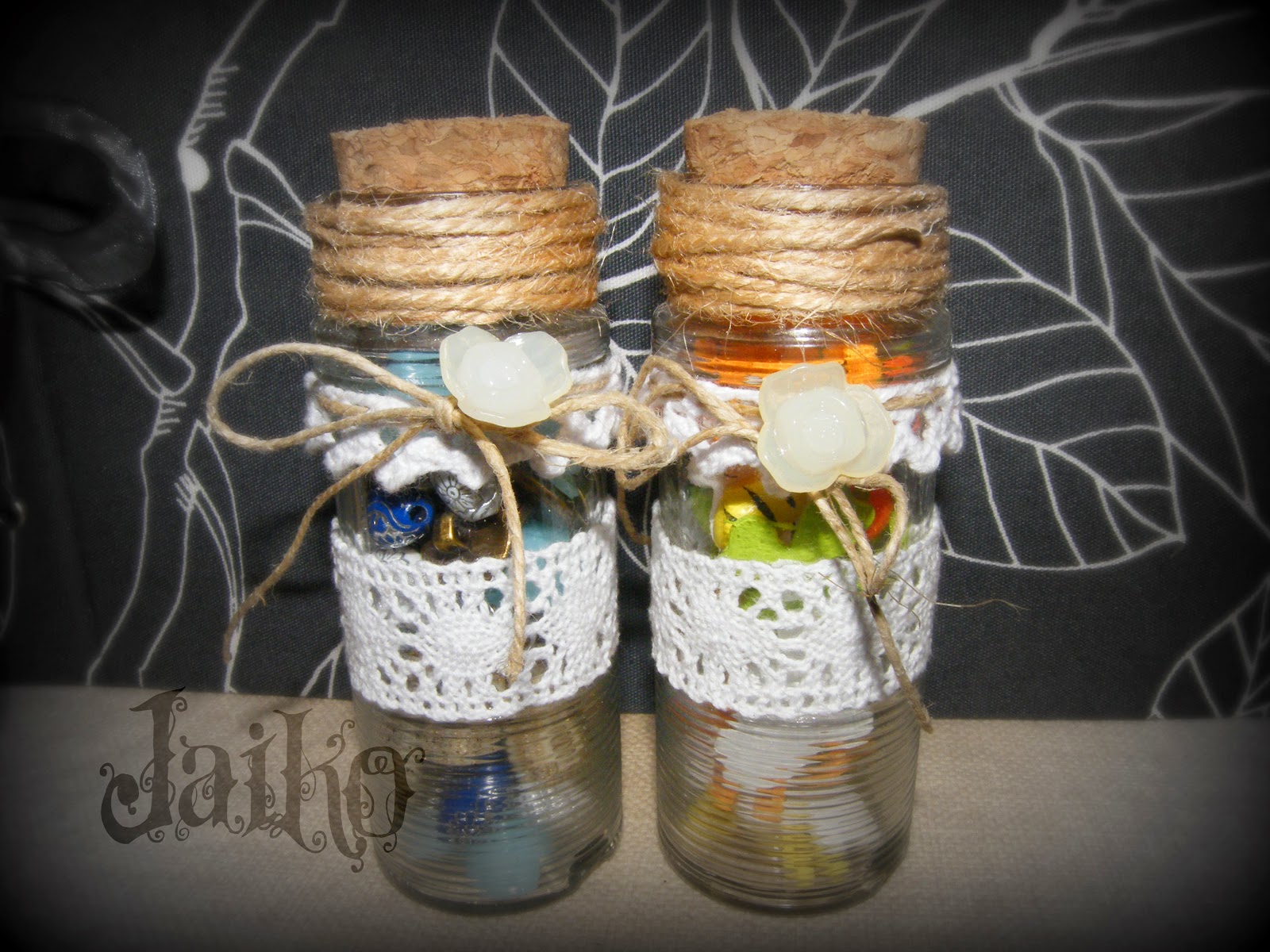 Los abalorios se los mandé en estos botecitos, he de ser sincera y decir que se los he copioteado a Nieves, los mios no tienen ese carácter extremeño que les da los tapones que su aita hizo con "la corcha" de las encinas de su tierra, pero se ha hecho lo que se ha podido jejejej