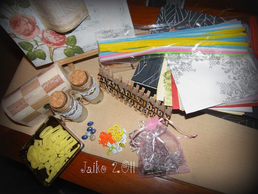 Además de una manualidad en el inter había que enviar material y como Lourdes tiene una imaginación estupenda y de cualquier cosa te hace una maravilla te he mandado alguna cosilla de abalorios, para hacer decoupage etc, espero que le guste y le sirva.