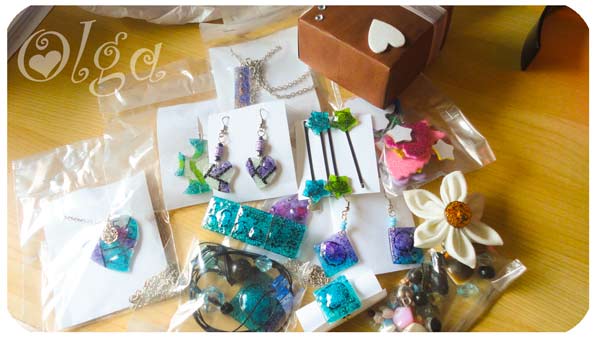 Cuando recibí el regalo de Sasha no podía dar crédito a mis ojos, que cantidad de cositas, que preciosidades, y había de todo, colgantes, horquillas, prendedores, anillos, pendientes, un llavero con forma de pez, abalorios, un broche, formas de goma eva... y además una carta adorable que me llegó muy hondo.