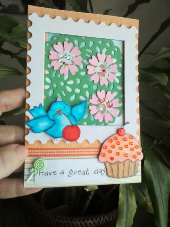 Dias después encontré en mi buzón la tarjeta de Lorena Sierco, qué puedo decir, con elementos muy sencillos consiguió una tarjeta preciosa, es toda una profesional. En su blog PAPELITOS DE FRESA hay trabajos geniales.