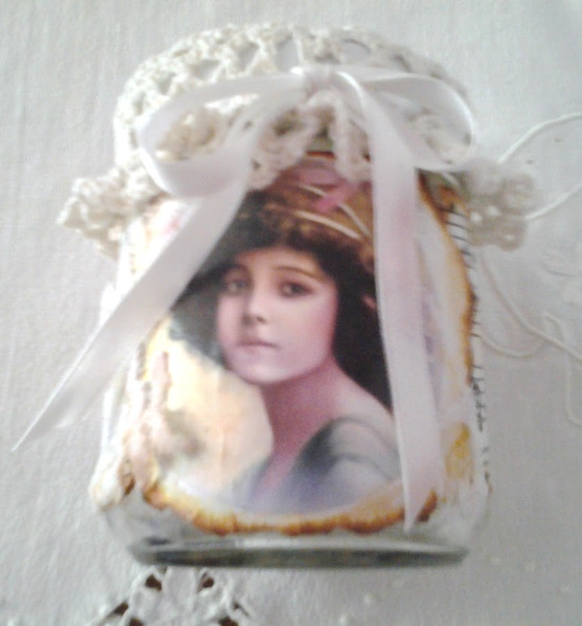 Un bote decorado con lámina de época y gorrito de ganchillo en la tapadera.
