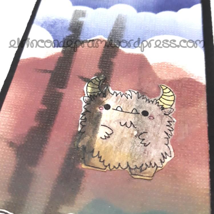 I made the background with different distress oxide inks and different stencils. I coloured the stamps with school wooden crayons. They are digital stamps by Las cajitas de Elvi, Useless trinkets y Licol Art.