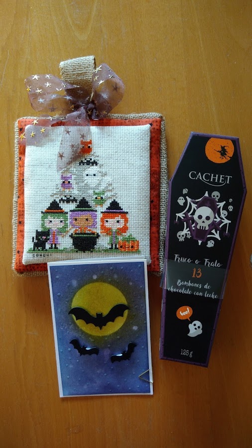 Siguiendo con el intercambio de Halloween toca ahora enseñar lo que envié yo. Me toco regalar a Isa Rejón y le borde esas tres brujitas tan monas.
