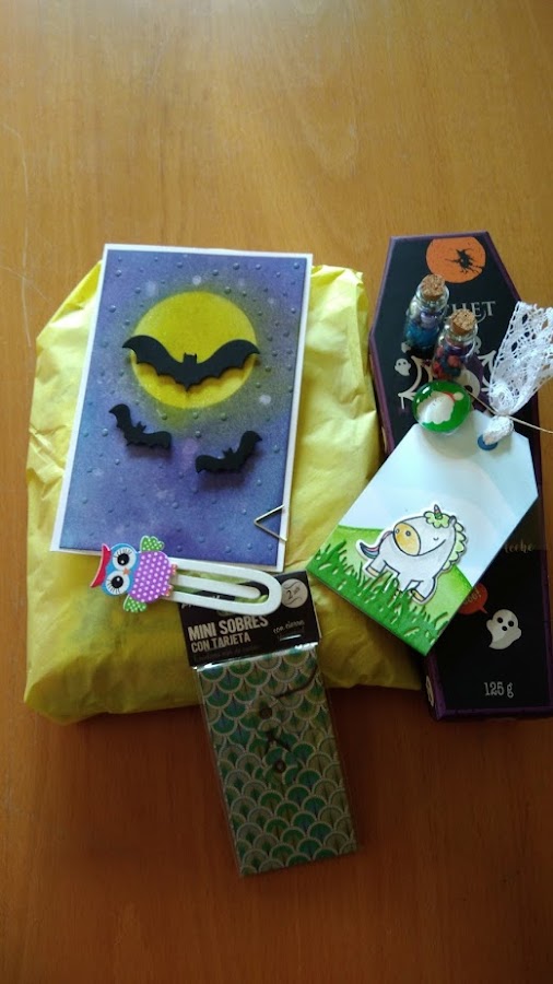 Complete el envió con unos bombomcitos y una postalita con murciélagos, le puse pintura de la que brilla en la oscuridad para darle el toque especial.....