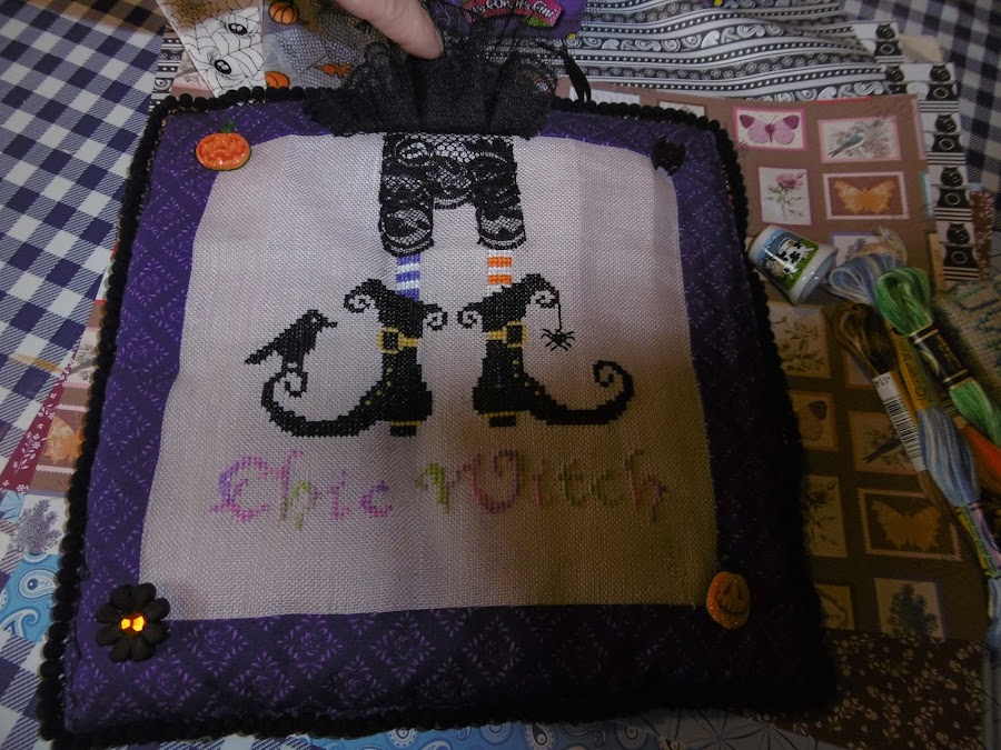 En el grupo Punto de Cruz hacemos un intercambio en estas fechas tan llenas de brujas...A mi me regaló Carmen Viedma, y con ayuda de una pistita pequeña que di....ya tengo mis zapatos de bruja con sus bragas y todo!!!!! Para completar: papeles, hilos, un cojincito, telas y como no chuches que mis hijos compartirán conmigo!!!!