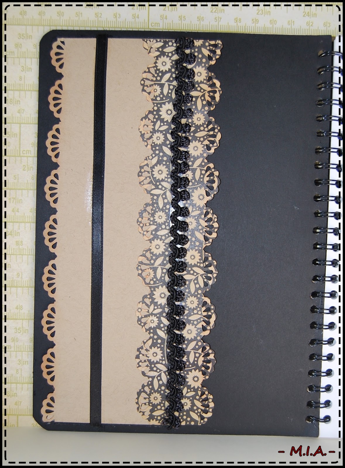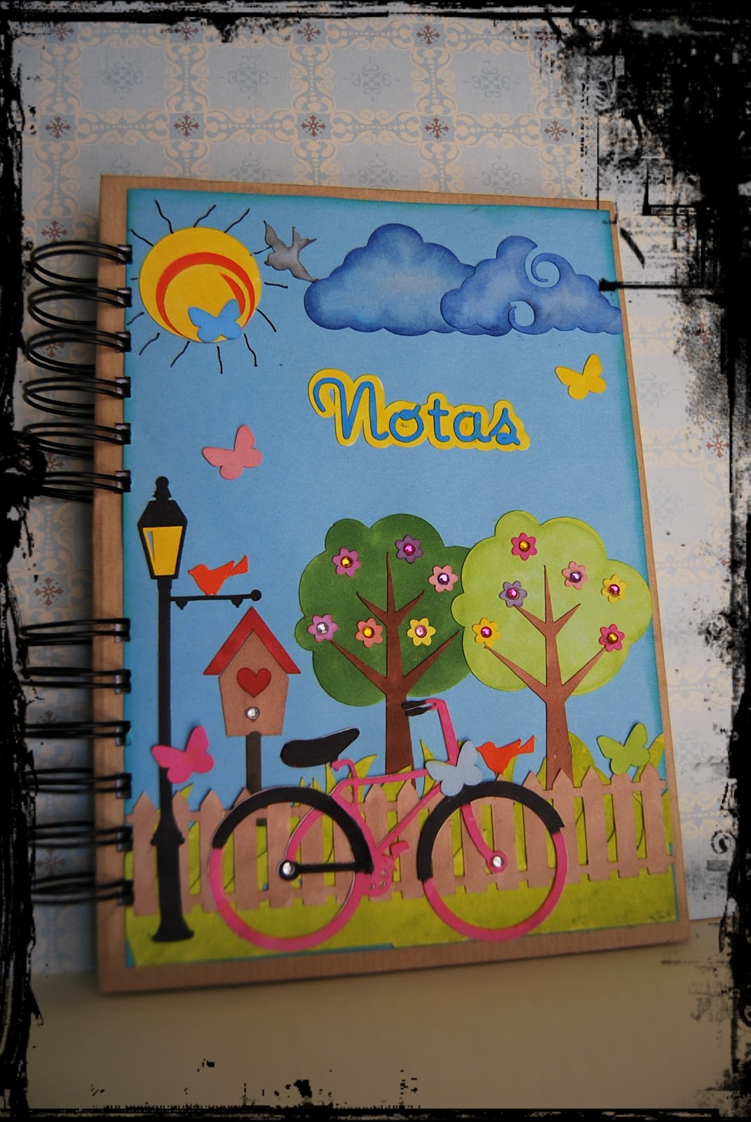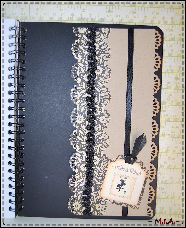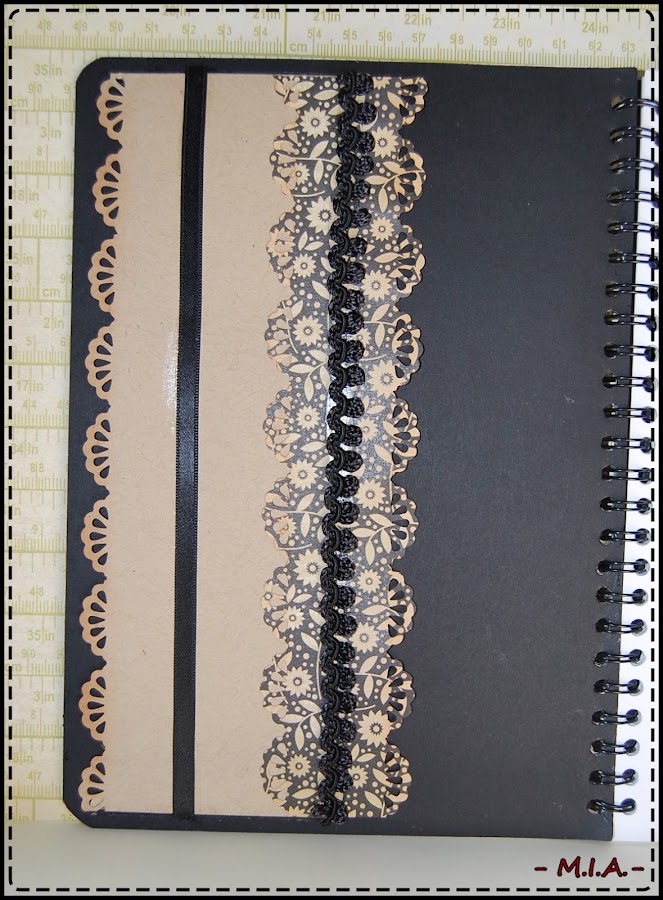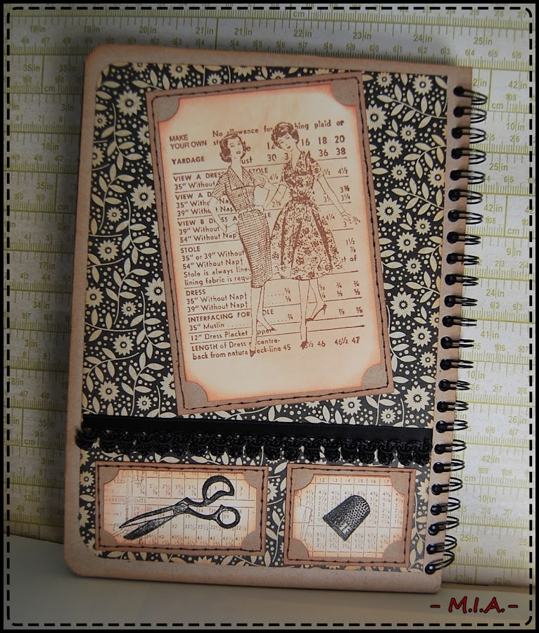 Y pensando en ella hice esta libreta para que anote las cositas que quiera... La base es un papel de My Mind"s Eye de la colección Lost and found2 (Sunshine). La decoré con el troquel de Tim Holtz "Movers Shapers" y unos charms con motivos de costrura.
