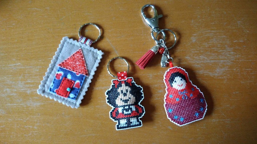 El intercambio con las chicas del grupo punto de cruz ha sido......un llavero!!!! cualquier técnica pero hecho a mano, eso si!!! Como veis mi pareja fue muy muy generosa y ademas de llaveros, si llaveros en plural, llegaron puntillas, botones, papeles, tijeras......