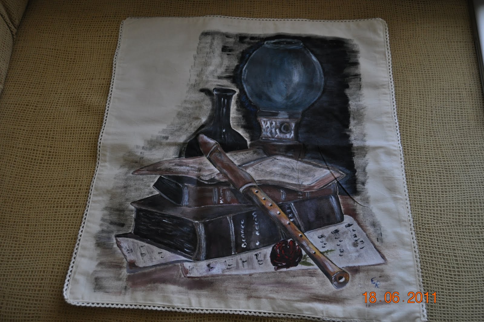 Y el mantel que es el objeto de este intercambio. Me ha pintado, como si fuera un lienzo, unos libros, unas partituras, una flauta y un quinqué porque sabe que me gusta mucho la lectura y la música.