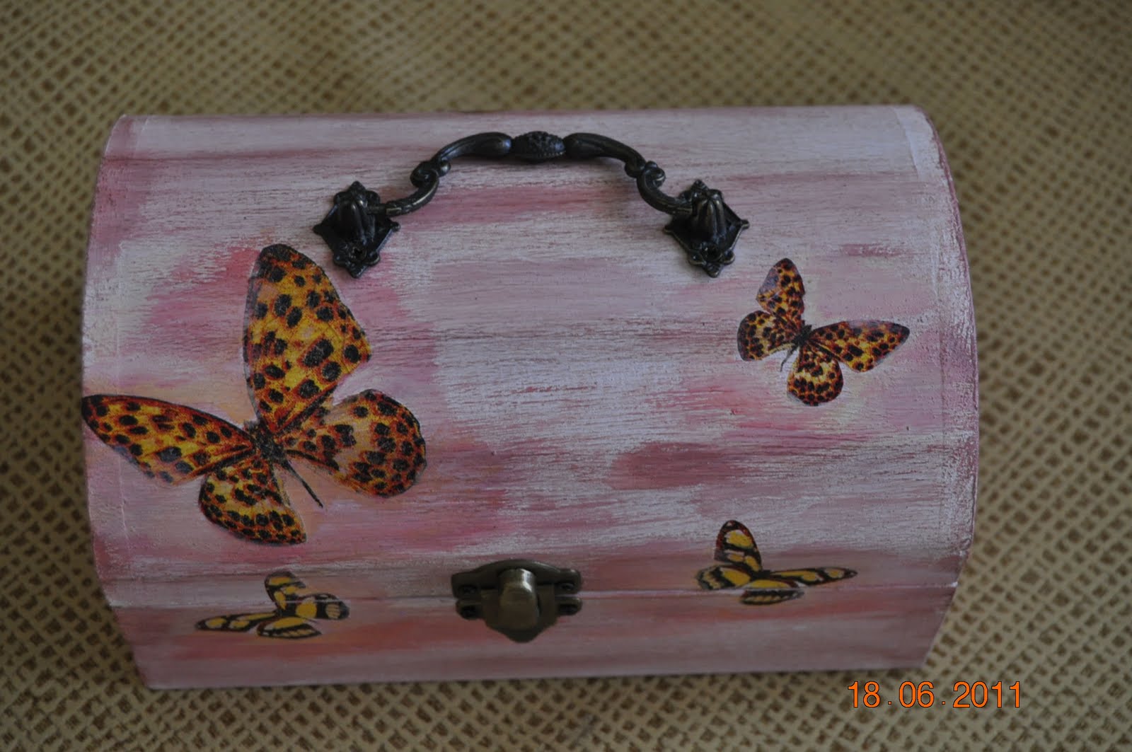 Una caja decapada con un asa preciosa decorada con mariposas en decoupage.