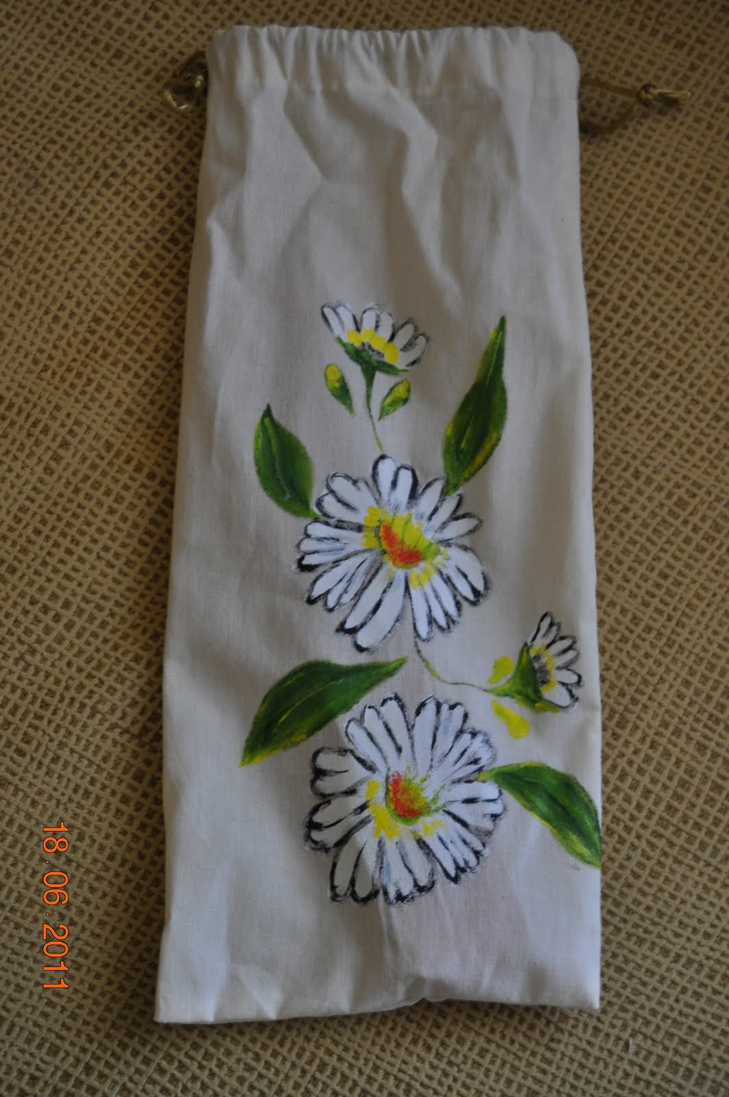 La bolsa donde se guarda el abanico también la ha pintado a mano con unas margaritas encantadoras.
