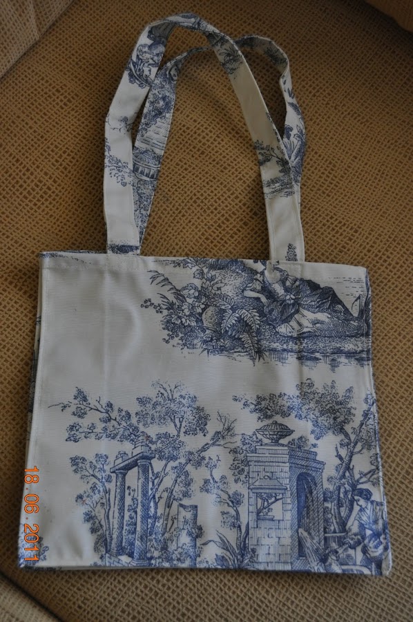 Un bolsa, hecha a mano, con tela Toile de Jouy plastificada. No me explico cómo encuentra Elena cosas de este estilo.