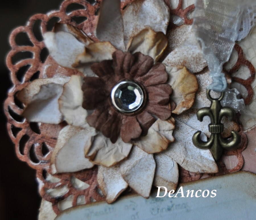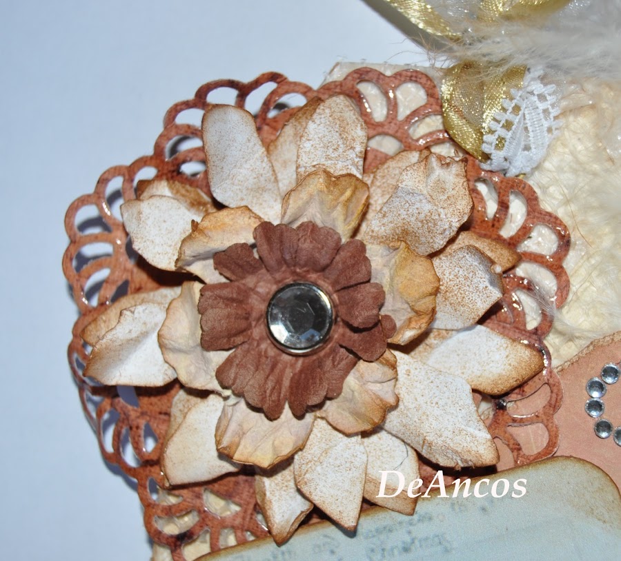Sobre un cartón forrado con papel de arroz en la cara principal, coloqué dos trozos de distintos papeles que sujetan unas plumas en tonos marrones y beige, encima de los cuales coloqué una imagen invernal de unos pájaros. Sobre ella hay una blonda con una flor hecha a mano siguiendo los consejos de la propia Goyi, rematada con un brad con un cristal blanco.