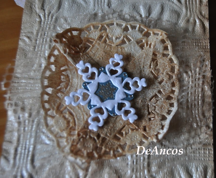 La trasera está forrada con un papel entelado de color marfil. Doblé y entinté una blonda sobre la que puse un sticker de copo de nieve. Encima añadí las palabras Feliz Navidad con un toque de glossy para dar relieve y brillo.