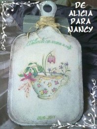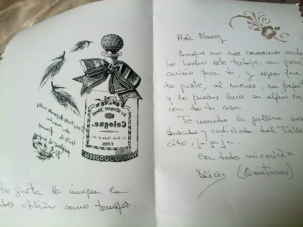 Vamos ahora con el lado más grato....la incertidumbre, la sorpresa, el momento de abrir mi regalo....y sobremanera cuando quien te regala es una de las verdaderas profes de el tallercito, no sólo por la perfección y el dominio de las técnicas, sino también por la exquisitez y el buen gusto que destila en cada uno de sus trabajos. Cuando me llegó el paquete y vi el remitente..... ¡ ME TENÍA QUE REGALAR QUINTANAR ! ¡ IBA A TENER UN AUTÉNTICO QUINTANAR EN MI CASA ! No cabía en mí de gozo, esta mujer tiene unas manos..y un gusto....vedlo vosotras mismas y opinad