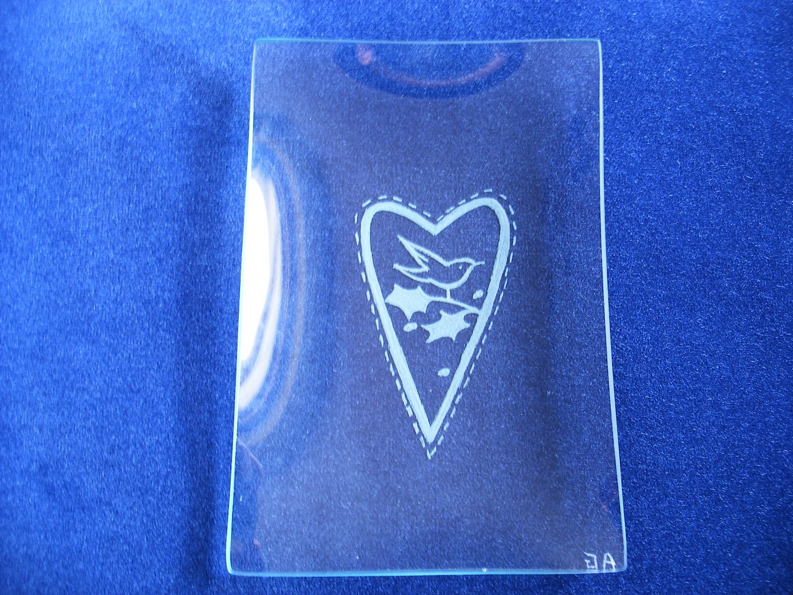 Una bandejita de cristal grabada con un motivo tilda....