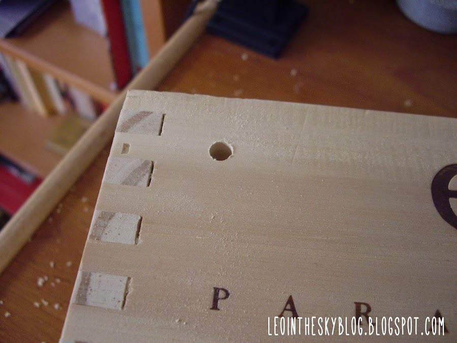 Para empezar la lijé bien por dentro y por fuera, le hice unos agujeros para poder colgarla y luego le di una mano de nogalina. No estoy muy puesta en esto de teñir madera con nogalina, y me sobró un montón y como no sabía si se podía guardar o no la acabé tirando..., ahora pienso que igual la podía haber guardado en un tarro de cristal... :(