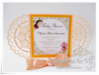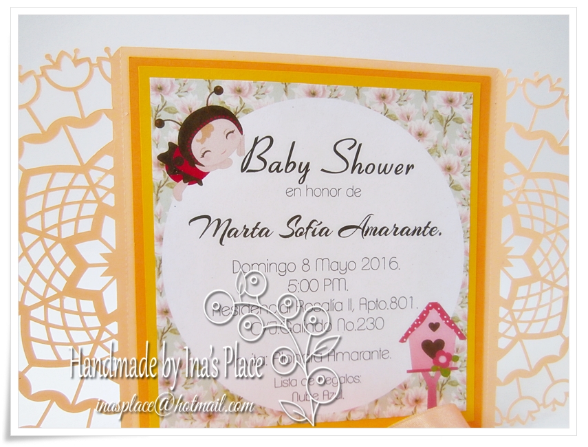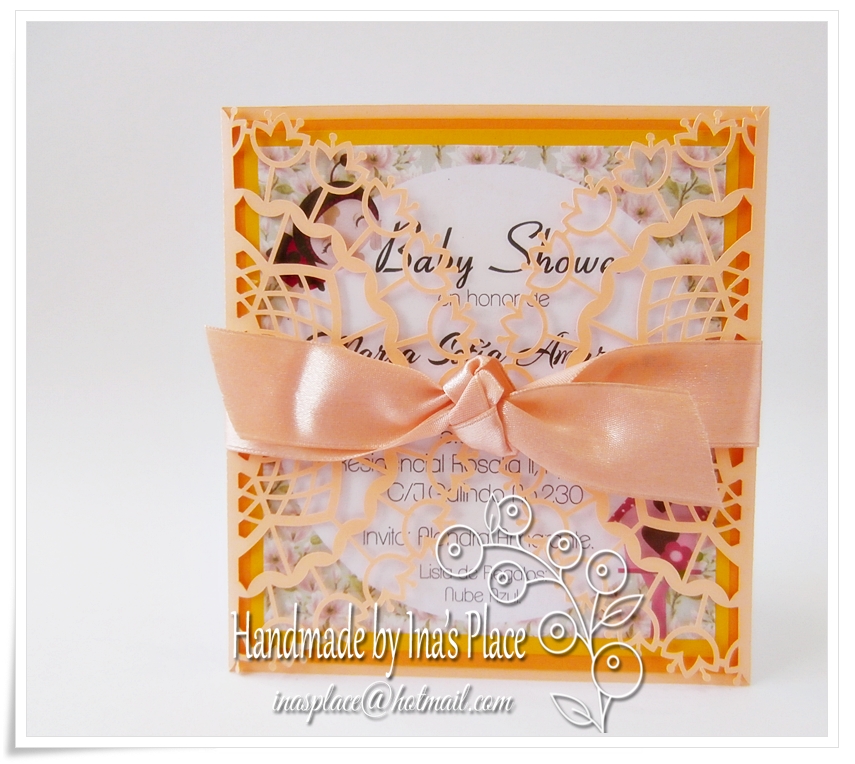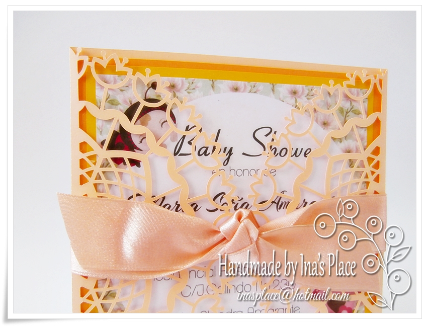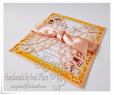 Feliz inicio de semana!! Para abrir el post de hoy les traigo una linda invitacion para Baby Shower donde los colores Lemon Drops y Peach son los protagonistas amén del diseño troquelado del sobre inspirado en las florecillas además del papel decorado que lleva en su interior, que es uno de mis favoritos!!