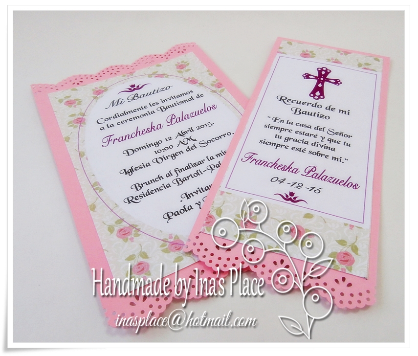 Bordes troquelados, papel de flores delicadas y sutiles y un pequeño detalle en la escritura del texto se conjugan para dar como resultado este primoroso diseño.