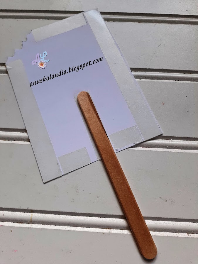 4.- Para poder pegar la cartulina blanca a la rosa, vamos a utilizar cinta de doble cara. Hice una prueba con pegamento y se humedece. En la última foto, vemos cómo pegar el palo de helado.