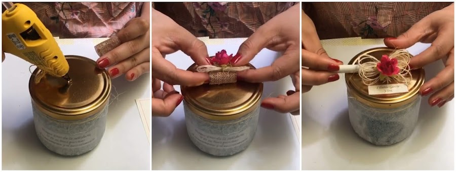 Seguimos decorando, ahora pegamos a la tapa el rollito de fique donde va la tarjeta y encima de este ponemos un moño de hilo fique y una flor a la que previamente hemos aplicado la misma mezcla de laca al agua y escarcha para darle un acabado mas bonito, enrollamos la tarjeta y la ponemos dentro del rollito de yute.