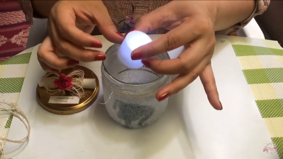 Para finalizar esta maravilla de manualidad pones dentro del frasco una velita led y listo.