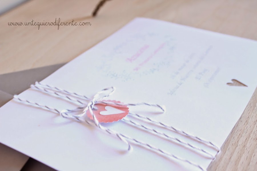 Es una invitación sencilla en papel kraft blanco. Los colores que combinan son gris claro y coral. Haciendo juego con el cordel en gris y blanco y la etiqueta troquelada en coral.