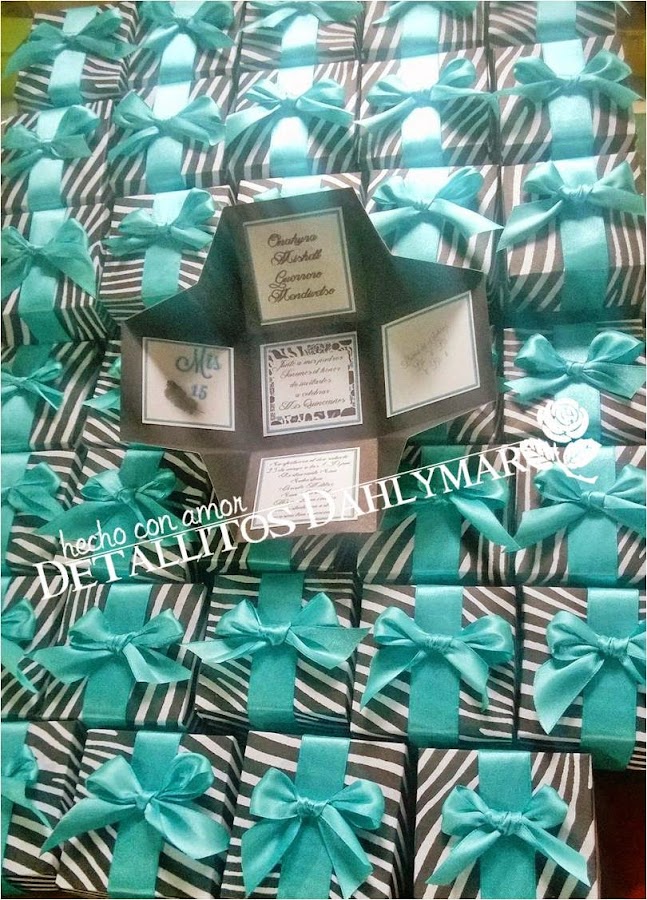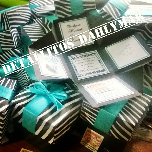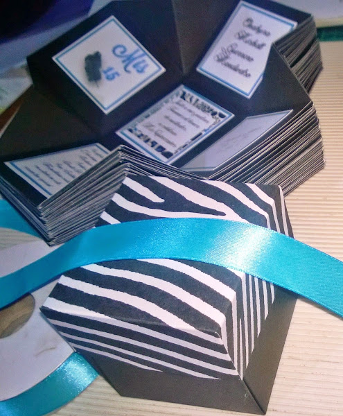 Uno de mis últimos trabajos realizados fue estas invitaciones tipo cajitas para unos quinceaños.. Al hablar con la mamá indagando sobre que le gustaba a la hija, fue dificil sacar información, sin embargo logré combinar 2 de sus gustos: Turquesa y Animal Print... y me puse manos a la obra!!