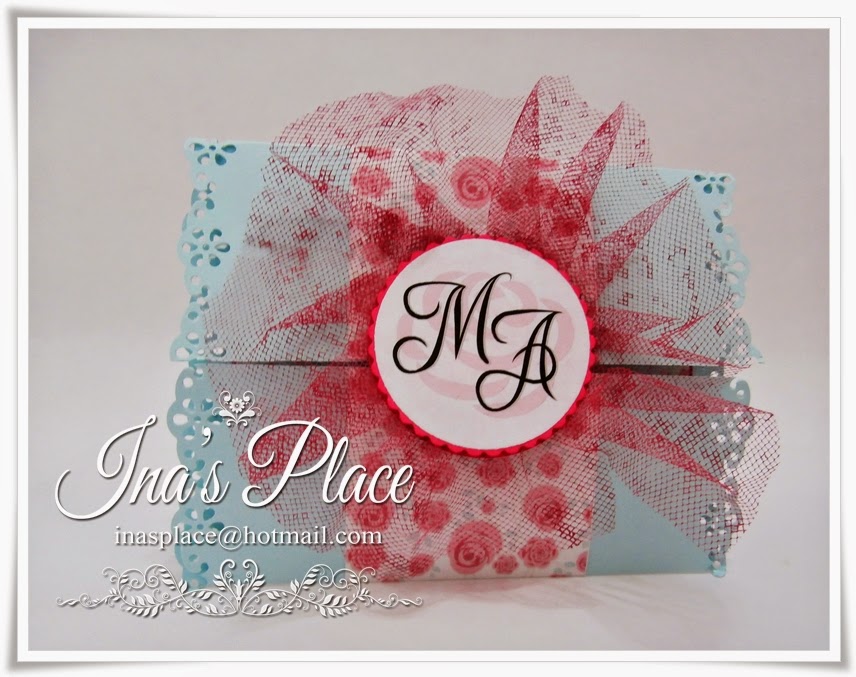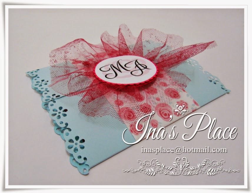 En este diseño la base era utilizar un papel decorado de rosas en tono rosa pálido por lo tanto como punto de enfoque necesitaba algo que no fuera una "flor",obvio no?? Jjijijij entonces me vino la idea de realizar una especie de medallón y colocarle tul(el cual tuve que teñir y no es muy fácil que digamos!!) Este es el resultado,me encantó el color base,delicado y femenino,igual que la invitación anterior.