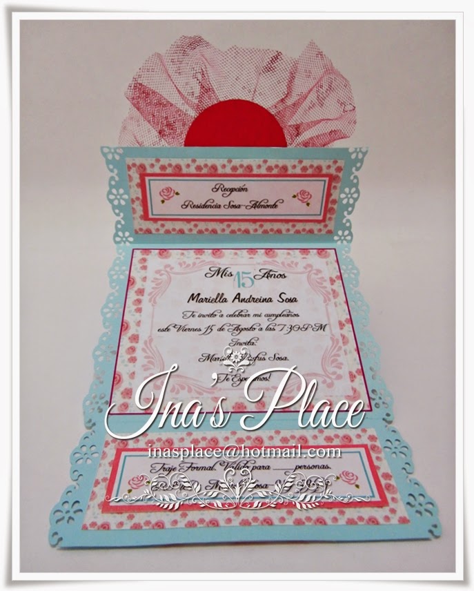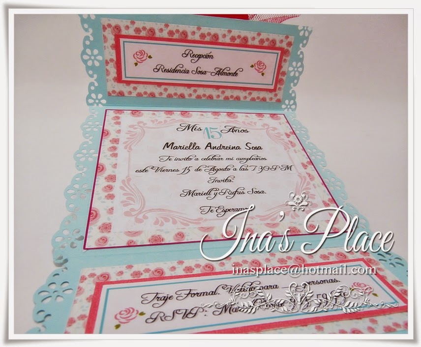 Aqui dentro de la invitación es mas elaborado,a petición de la cumpleañera,no se ve muy recargado,y mirandola bien me parece casi,casi un estilo Shabby,no creen??
