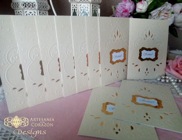 Tarjeta nacarada en tono marfil empolvado, con diseño troquelado y texturizado, contraste trasero en dorado, frontal personalizado con su nombre y en la parte posterior, el texto.