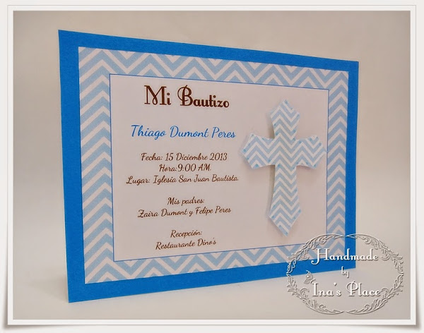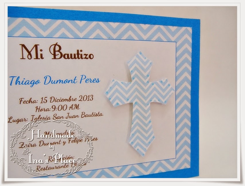 Buen Dia!! y Feliz Miércoles (: Pues en el dia de hoy les muestro tres invitaciones realizadas para Bautizo.En ellas he utilizado el color azul como base y le di rienda suelta a mi creatividad. Mi combinación preferida por excelencia: el azul con marrón, me parece una mezcla elegante,no creen?? En esta ocasión decidí realizar la cruz con el papel estampado para tener una mejor coordinación. En e ...
