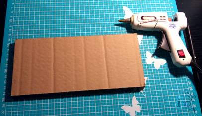 A continuación pegamos una pieza de goma eva por cada lado del cartón. Esto se puede hacer con cualquier pegamento que pegue la goma eva, pero ya que tenemos la pistola de silicona a mano yo lo hago con la misma pistola.