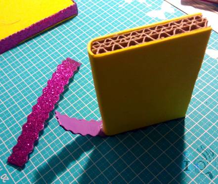 Entonces medimos el grosor del cartón más las dos piezas de gomaeva y cortamos una tira larga de gomaeva del otro color. Yo la recorto del lado largo del A3 que es lo más largo que da. Esta tira se puede cortar recta pero si la cortáis con unas tijeras con motivo en la parte que va a quedar hacia arriba queda un poco más mono. Luego se va pegando la tira poco a poco por todo el borde de la base.