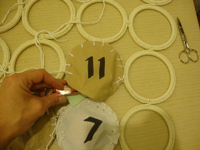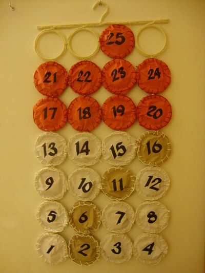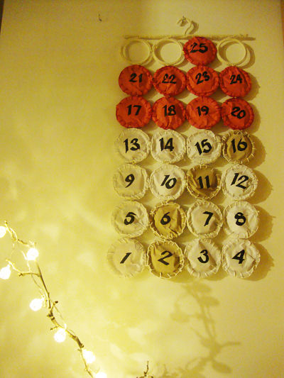 La idea es usar la estructura para colgar pañuelos como base para el calendario y colocar en cada uno de sus círculos una bolsita hecha con papel para meter los regalitos y mensajes positivos.