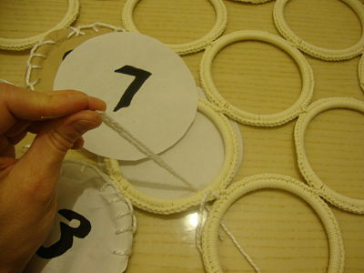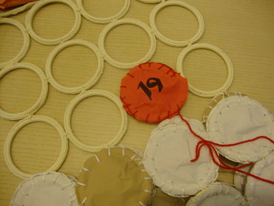 Para coserlo sin que se muevan mucho los otros paquetitos que ya están hechos y coser con comodidad, nosotros lo colocamos en una mesa con toda la estructura extendida y fuimos cosiendo los agujeros de dentro hacia fuera.