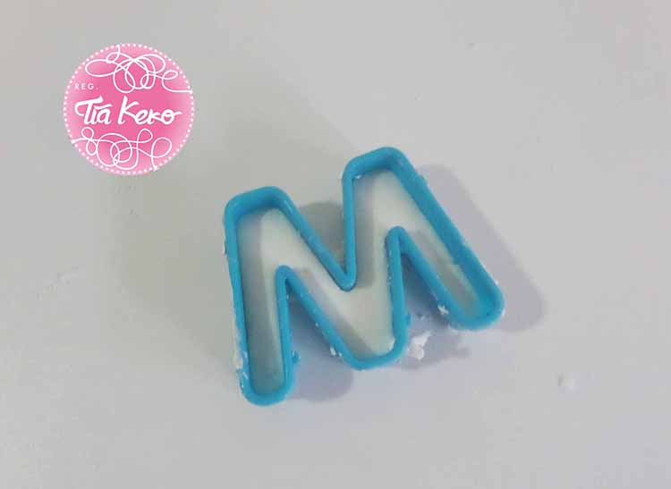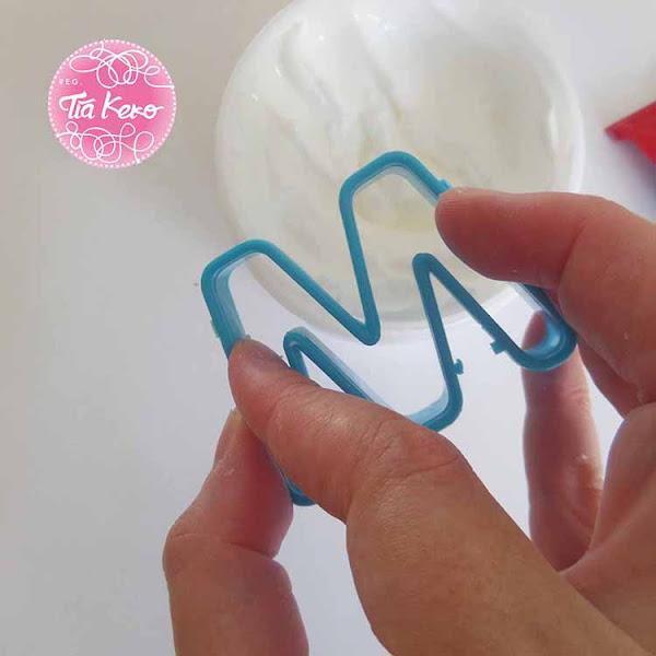 El caso es que con mucho cuidado vamos a aplastar la masa de silicona hasta hacer una placa con la masa para poner el molde encima, igual que si trabajáramos en repostería. Antes de utilizar el molde, tenemos que acordarnos de poner crema de manos o de cuerpo por todo el interior del molde, para que luego sea más fácil desmoldar la inicial. Si ya tenemos el molde con la crema, lo ponemos encima de la masa y presionamos hasta que corte la masa, igual que si estuviéramos haciendo un pastel con forma. Y ya tenemos la inicial hecha, la dejamos secar un poco y la sacamos del molde.