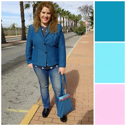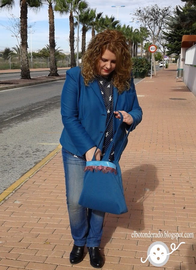 Cuando terminé la blazer me sobró un trozo, le dí muchas vueltas y finalmente decidí hacer un bolso a juego, decorándolo con una tira de polipiel turquesa y plumas de color rosa.