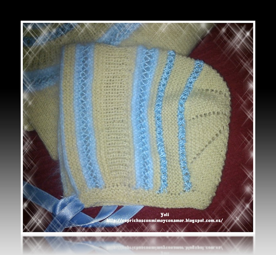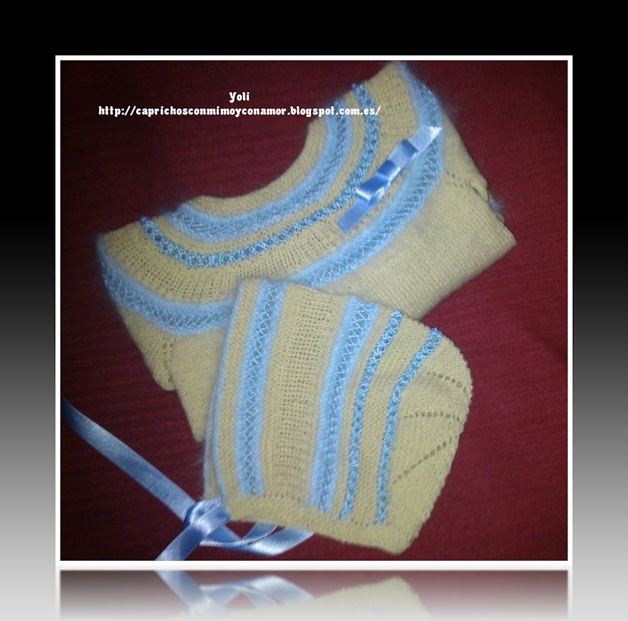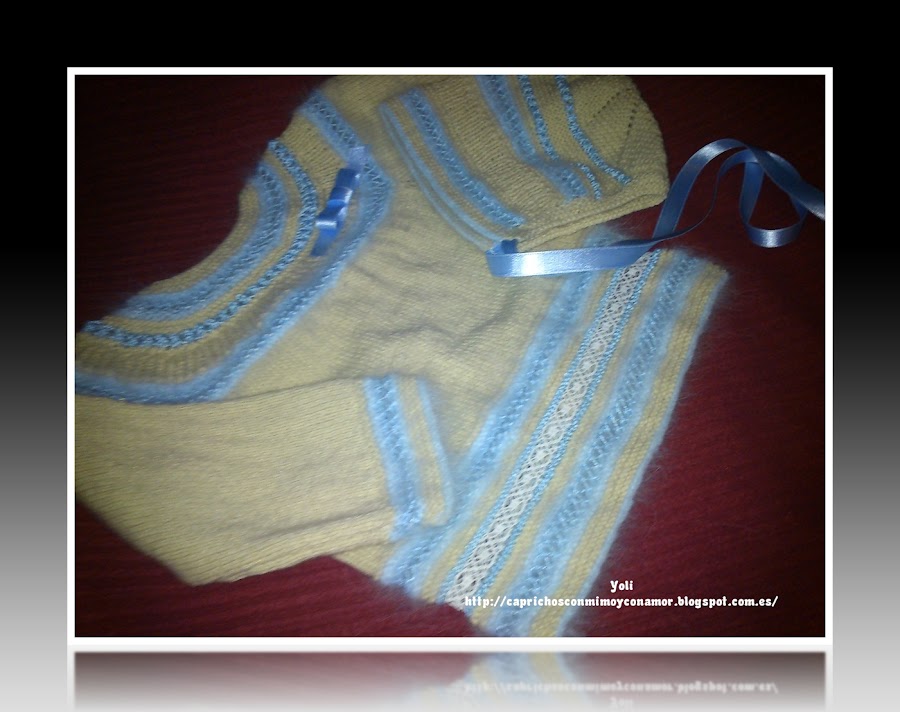 Aun así a ratitos he conseguido terminar de rematar este conjunto, es para el primogénit@ de Iván, así se llama el papi y como aun no esta claro aunque todo apunta a que sera niño...al 97% le hemos tejido en camel con celeste, os enseñe el comienzo en otra entrada os acordáis??