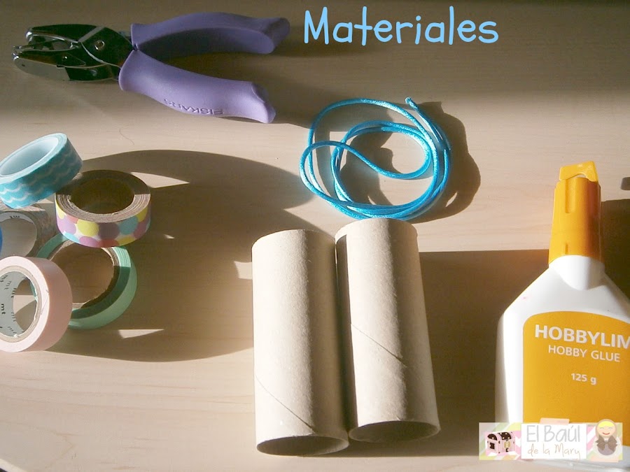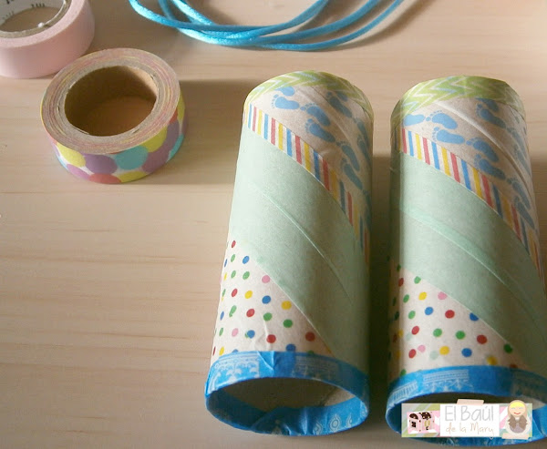 Dos tubos de papel higiénico vacíos, washis de colores, pegamento de manualidades, cola de ratón o cualquier otra cinta y una taladradora. Pocos materiales ¿Verdad?