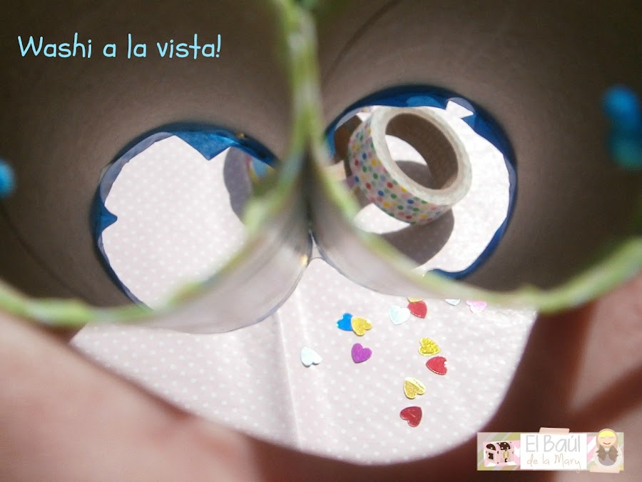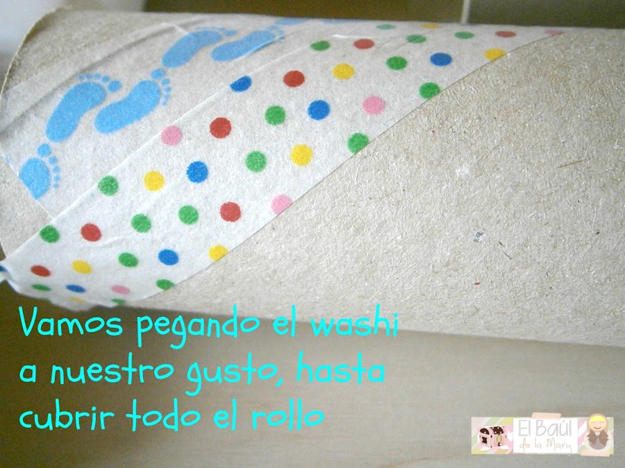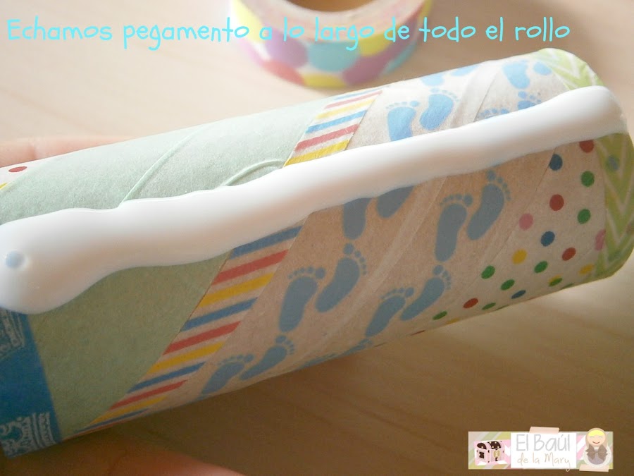 Para ponerlo más bonito y tapar los finales colocamos una tira de washi que doblaremos por dentro del rollo, como veis en la siguiente imagen