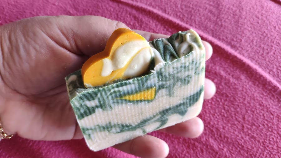 Las figuras corazón, elaboradas previamente, llevan aceite esencial de limón, pero yo siempre digo que no huele a limón fresco, así que en el jabón eché aceites esenciales de lima verde, de litsea cubeba y de salvia, todo aromas alimonados que convierten a este jabón en un jabón refrescante, desde luego.