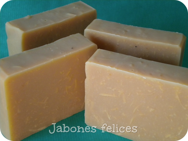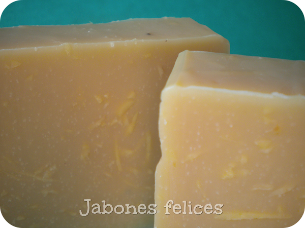 Este jabón lleva leche de cabra y virutas de otro jabón de naranja con semillas de amapola.