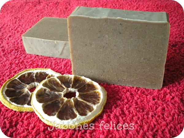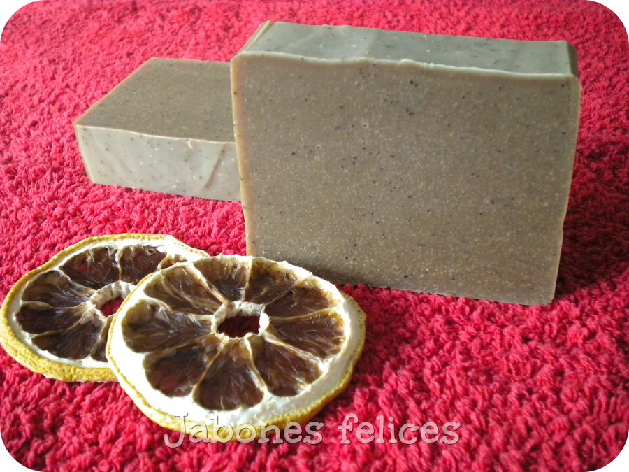 Componentes: café, agua destilada, hidróxido de sodio, aceites de oliva, almendras dulces, girasol, coco, palma, cera de abeja ecológica y aceite esencial de naranja.