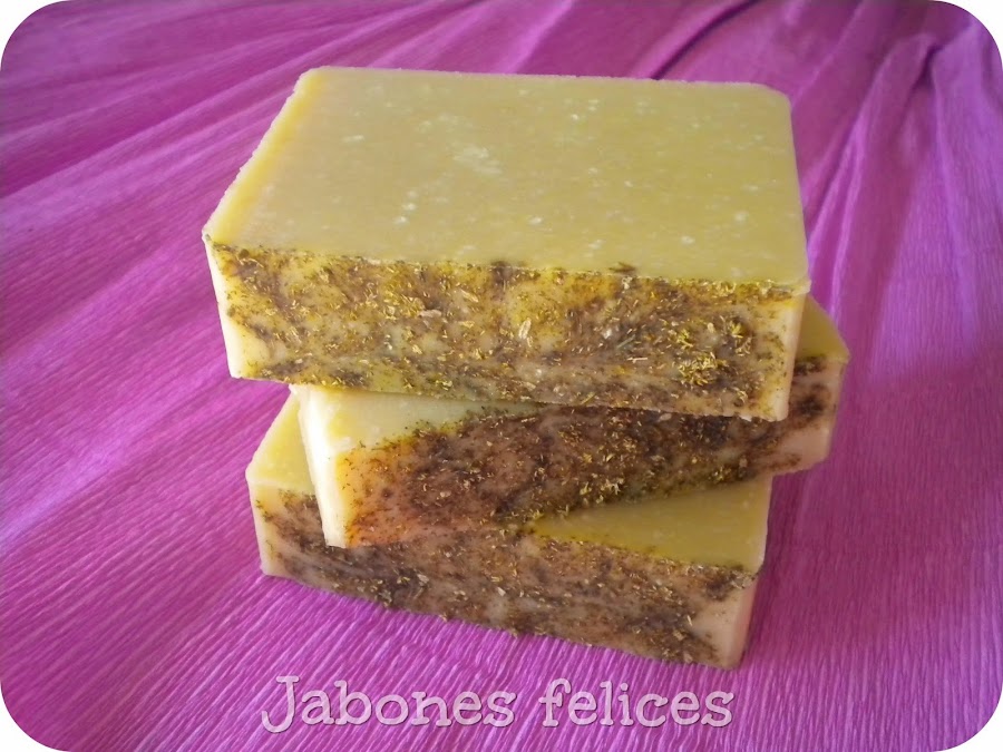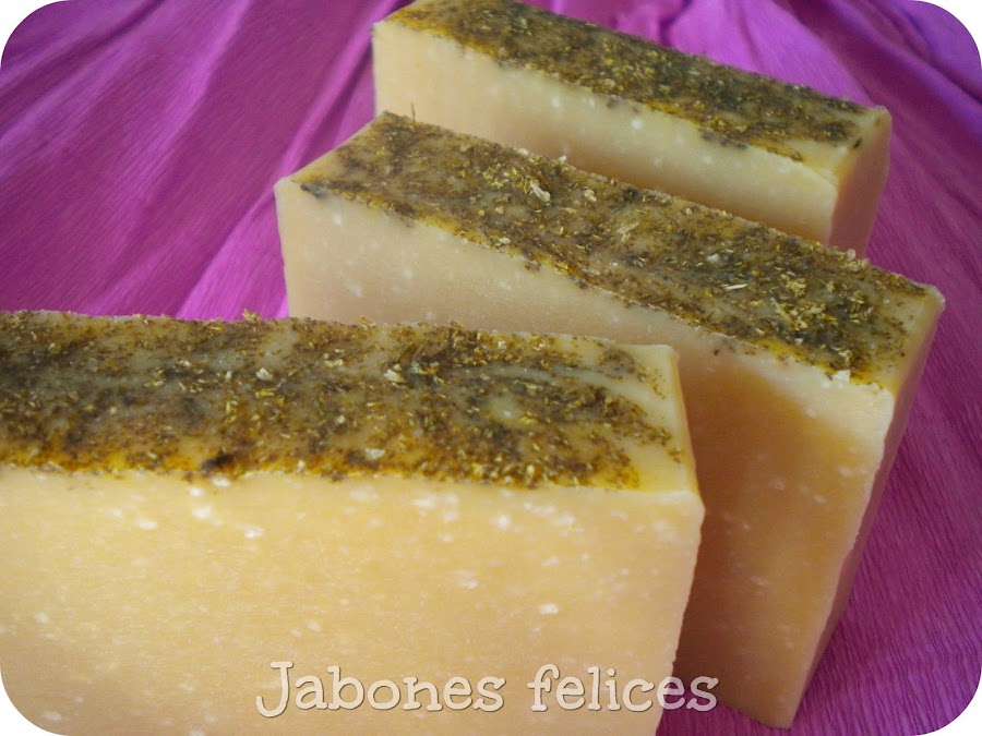 Lo he hecho con leche de avena casera, siguiendo las instrucciones que mi compañera jabonera Noe explica muy bien aquí, jugo de aloe vera, oleatos de manzanilla tanto en aceite de oliva virgen extra como de almendras dulces, este último como sobreengrasado.