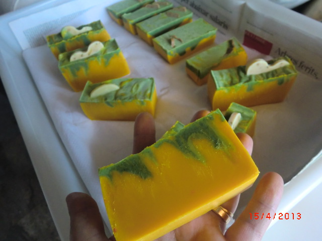 En este caso, éste de zanahoria no lo recomiendo para la cara por el tema de amarilleo aunque todo es probarlo, pero para el cuerpo no habrá problema. Se deja un ratito con su espuma mientras nos lavamos la cabeza, por ejemplo, y que los aceites penetren en la piel....En mi caso, tengo una piel que se broncea rápido y fácil. No voy a usarlo. Y porque tampoco hice una tanda cuantiosa, hay pocas piezas.