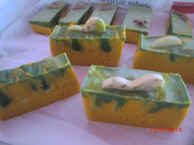 Aviso que destiñe un poco, pero para la ducha no hay problema. No entiendo como veo jabones totalmente morados o totalmente rojos, incluso negros!....siempre me pregunto si desteñirán. Lo lógico es que sí dado que los colores son añadidos a propósito en gran cantidad para conseguir el efecto estético tan bonito, pero ¿será práctico?. Supongo que tendrán un fin sólo para lavar las manos, entonces no importará...pero es una lástima que estos jabones sólo se usen para las manos, no? Yo pienso en su uso facial sobre todo.