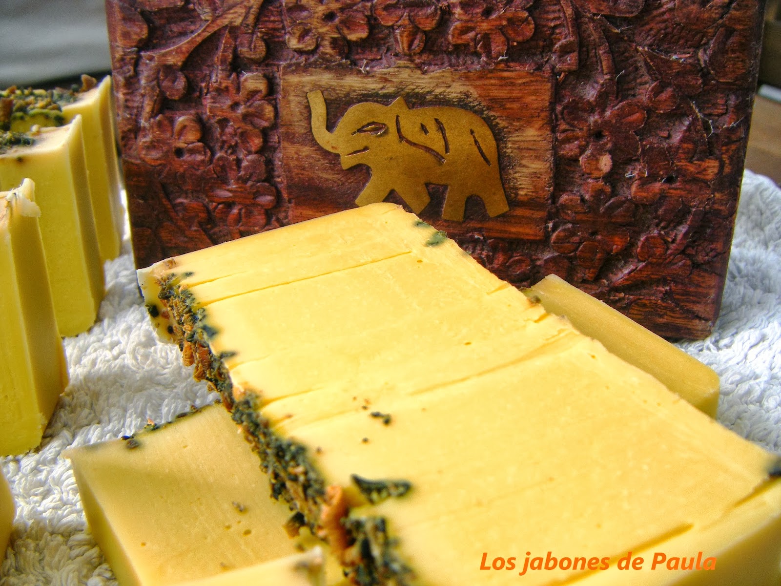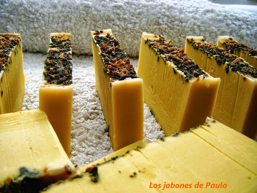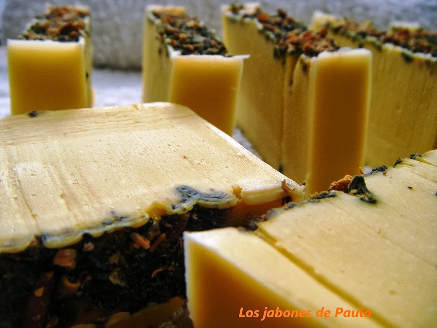 Este jabón está hecho con el oleato en aceite de Oliva Virgen Extra que veis en la foto, Zumo de zanahoria en vez de agua y la zanahoria que estuvo varios días secándose al sol, después la trituré y quedaron trocitos muy pequeños, algunos de ellos eran polvo de zanahoria. Después del secado he podido comprobar que muchos de esos trocitos con los que espolvoreé el jabón se han oxidado un poco, pero que al empezar a usar el jabón desaparecen por completo, algunos incluso volviendose naranjas otra vez. Misterios del jabón !! Lleva como no Aceite de Coco y Aceite esencial de Arbol de Té.
