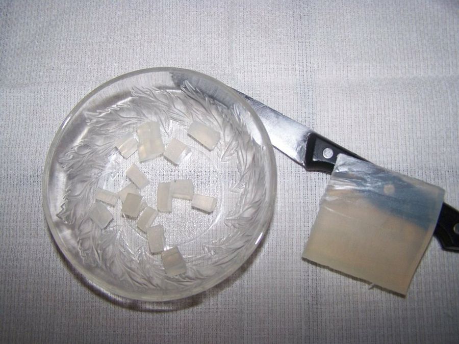 Cortamos el jabón en lonchas, vamos haciendo cuadraditos pequeños y los echamos en el recipiente para derretir.