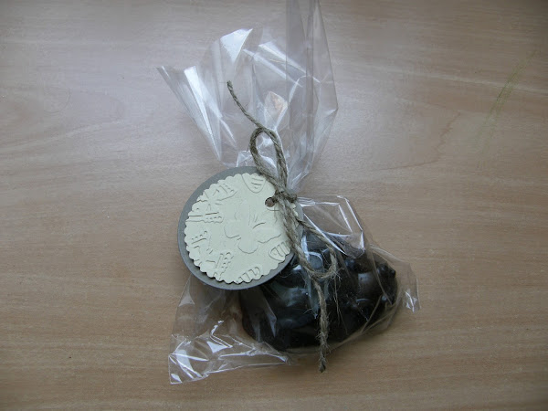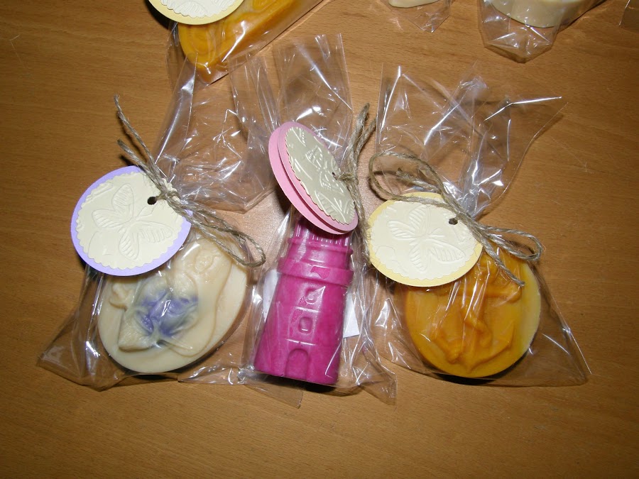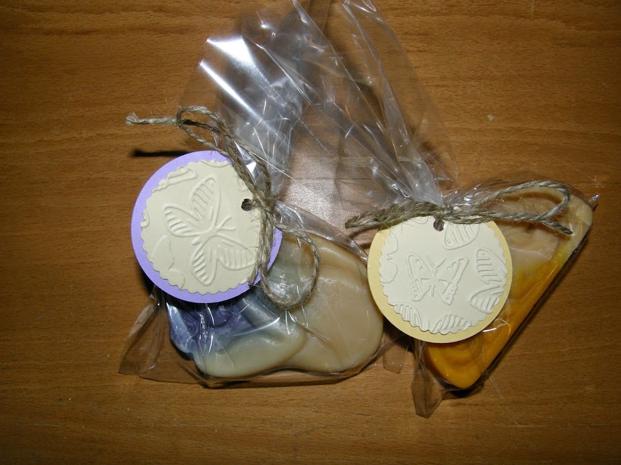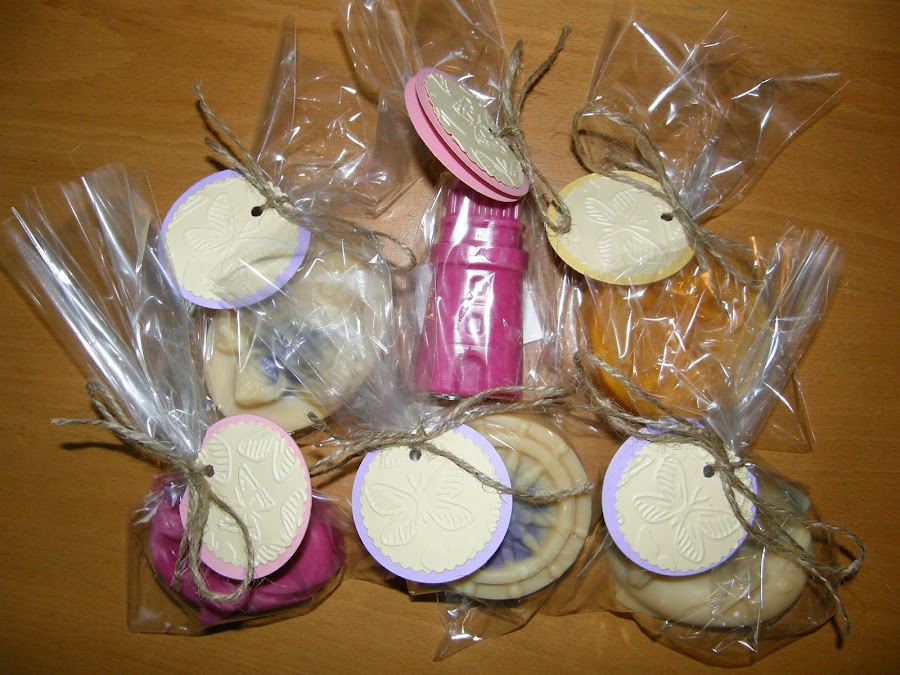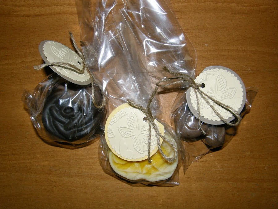 Un detalle de la etiqueta, las hice también de cuatro colores como los aromas troquelas en forma de circulo doble para que fuera una pequeña tarjeta donde Cristina pueda poner su nombre la fecha o una dedicatoria y sobre ello un circulo troquelado con festón y con relieve de mariposas en un color crema, para atarlo me gusto la idea de la curda rustica para no recargar demasiado.