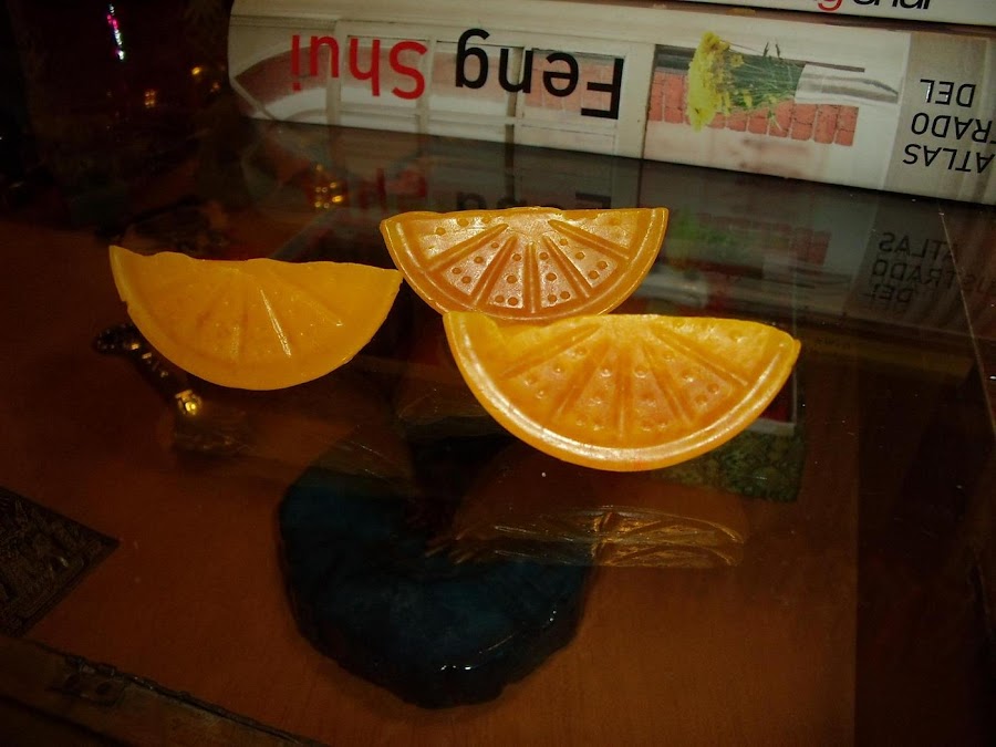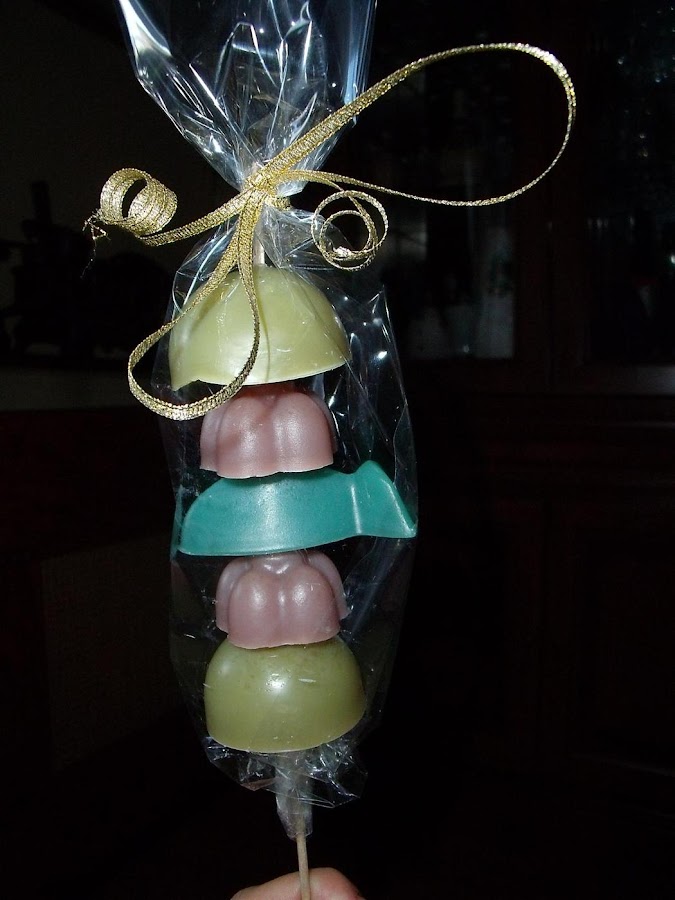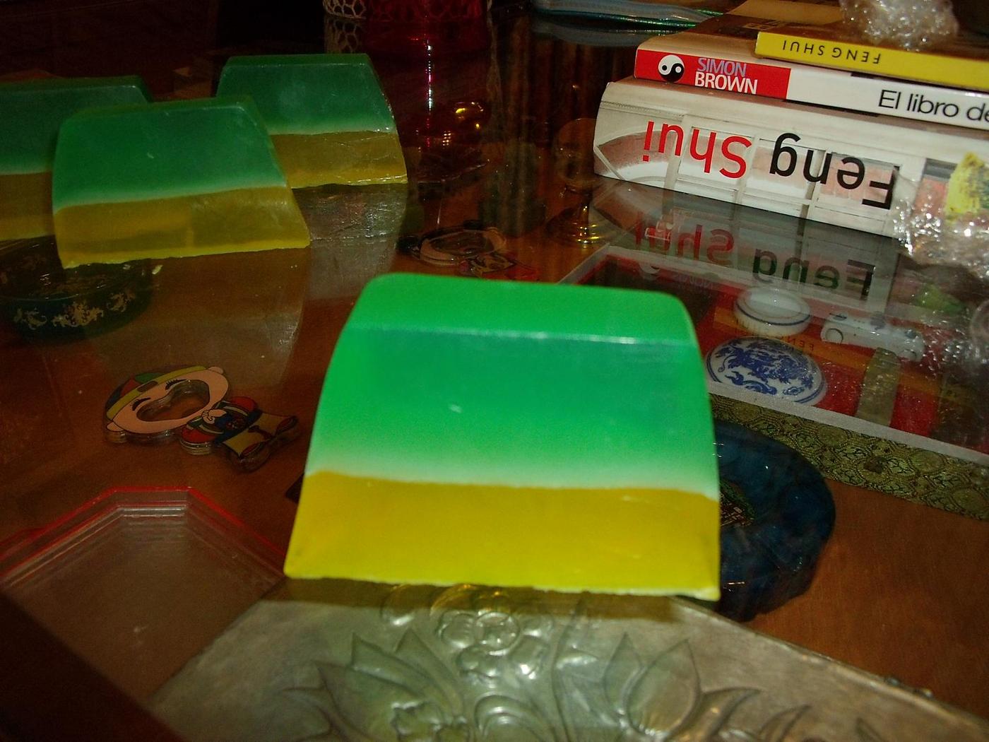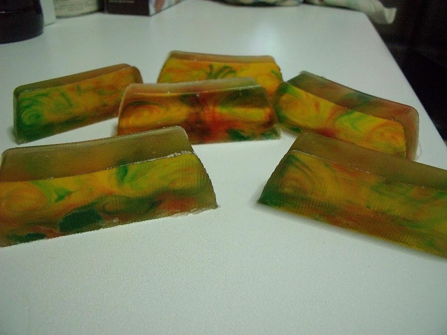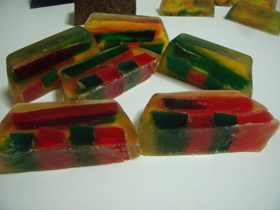 Estos son muy bonitos, os cuento como se hacen, haceis jabon de un color y reservais ya seco, haceis otro de otro color y reservais también, en mi caso lo hice verde y rojo. Luego cojeis y haceis un jabón de un tercer color, en mi caso amarillo, y cuando esté todavía líquido pero ya en su molde, cojeis uno de los jabones que teníais reservados y con un pelapatatas haceis como cuando pelais patatas, sacais virutas y las meteis en el jabón que está liquido, meter todas las virutas que querais y con el calorcito se funden pero se quedan donde las dejeis. Esperais que se sequen y desmoldais. Ya vereis que bonitos.
